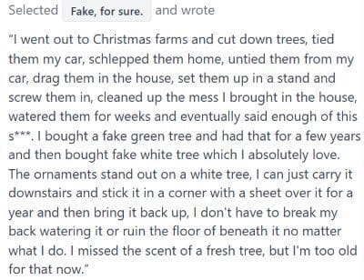 Based on our very scientific findings from Monday’s poll, 74% of Buzz Nation prefers fake Christmas Trees over the real thing. I’m going to share one response that hit the nail on the head from our perspective: