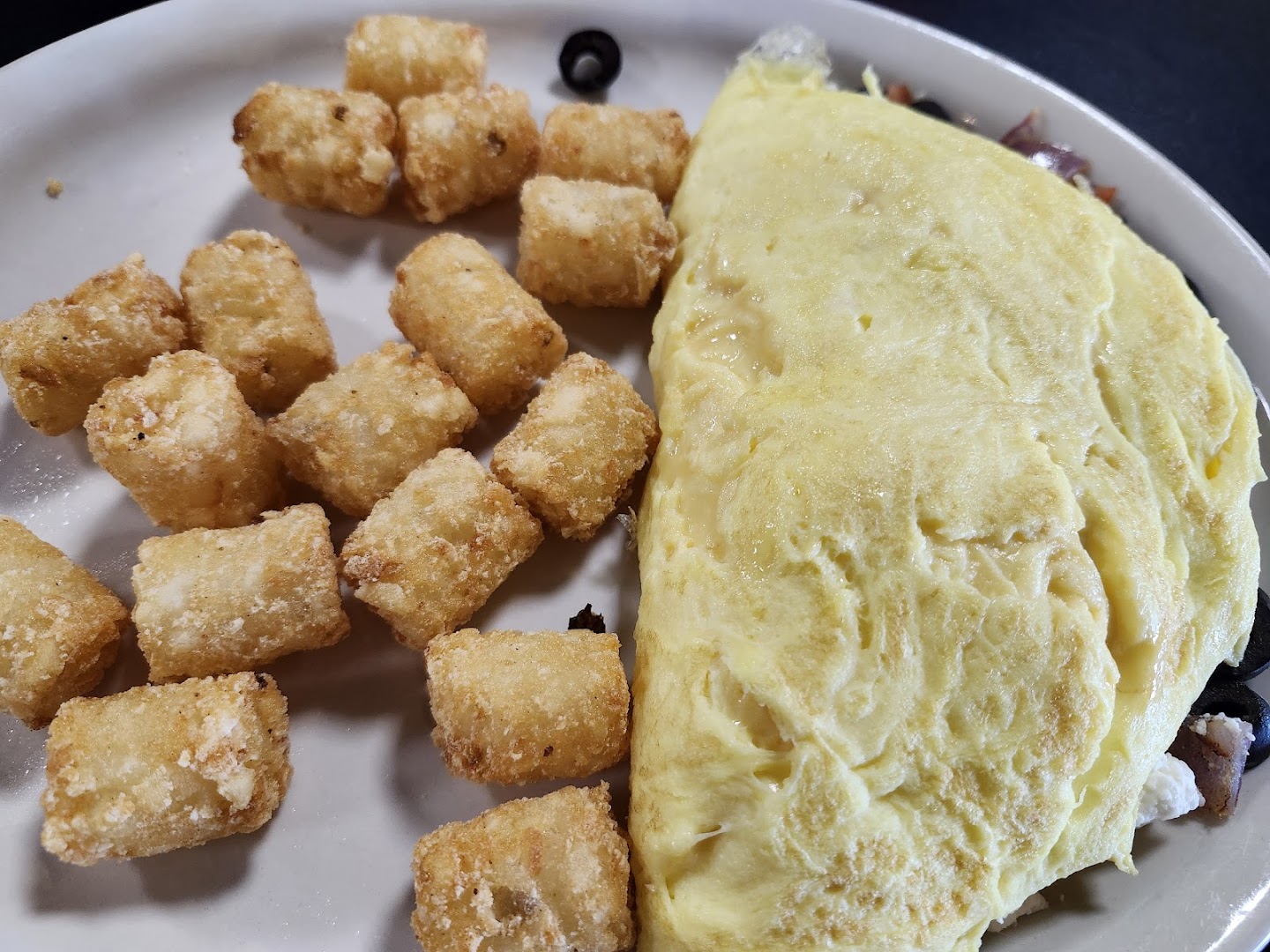 Breakfast classics, Greek Omelette, Buffalo Chicken Wrap, Country Fried Steak, Tater Tots, Pancakes, French Toast, Bacon, Hash Browns, Gyro, Coffee