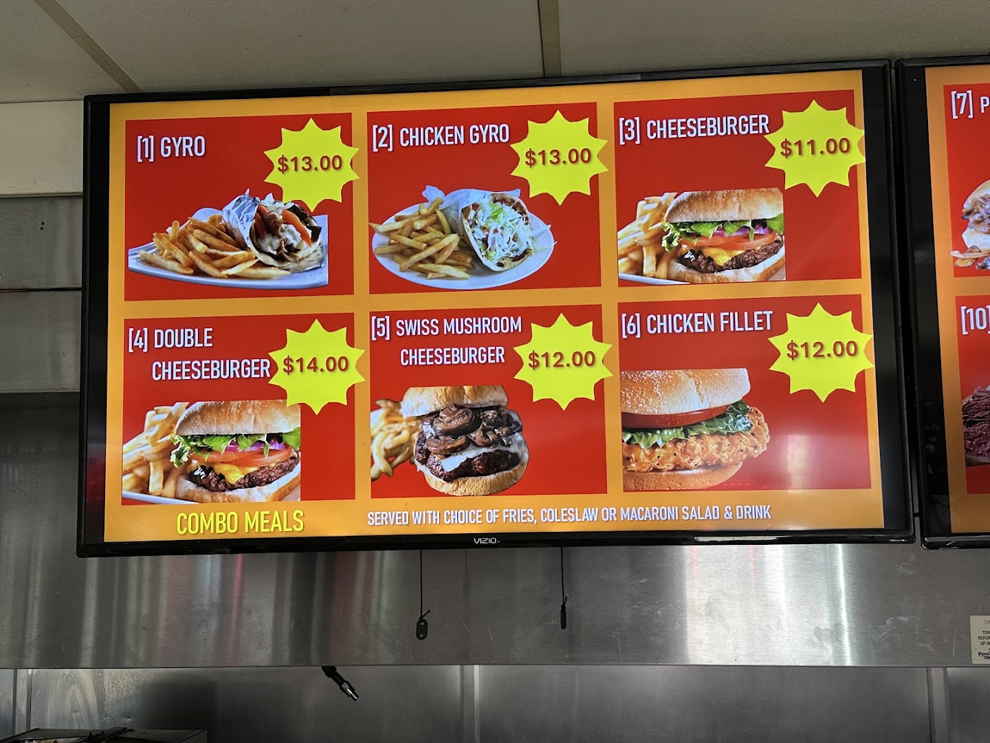 Philly Cheesesteak, Chicken Philly with Onions Mushrooms and Green Peppers, Gyro Sandwich, Polish Boy, Corned Beef Sandwich, Breaded Mushrooms, Chicken Wrap, 6 Wing Dings, Seasoned Fries