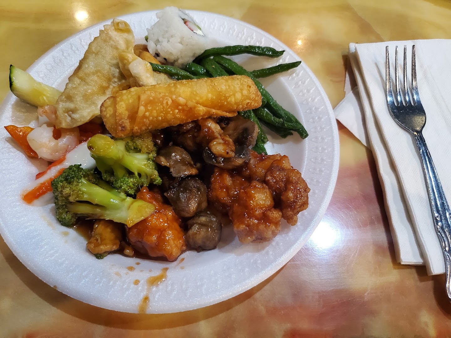Patrons appreciate the generous buffet variety, friendly staff, and affordable prices, especially praising sushi and soup options. However, recurring concerns highlight cleanliness issues, use of styrofoam plates, and inconsistent food freshness, affecting overall satisfaction.