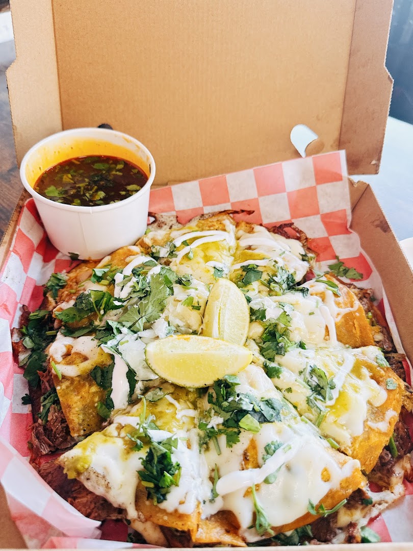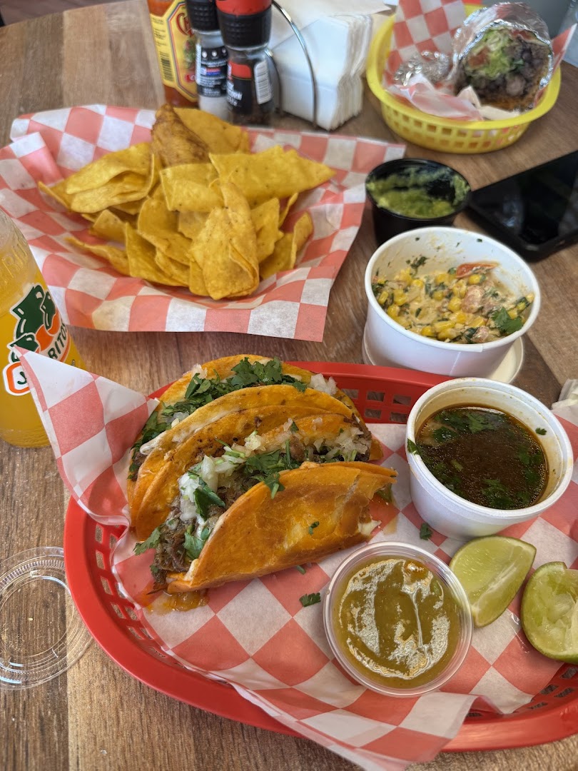 Birria, Burritos, Tacos: Al Pastor, Carne Asada, Steak, Chicken; Quesadillas, Chips, Horchata, Street Corn Dip, Rice Bowls