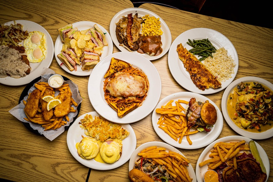 Eggs Benedict, Pancakes, Sausage, Bacon, Mashed Potatoes, Salad, Fish and Chips, Burgers, Corned Beef Hash Skillet, Coconut Pie, Coffee, Beer, Cocktails, Wine, Comfort Food, Small Plates